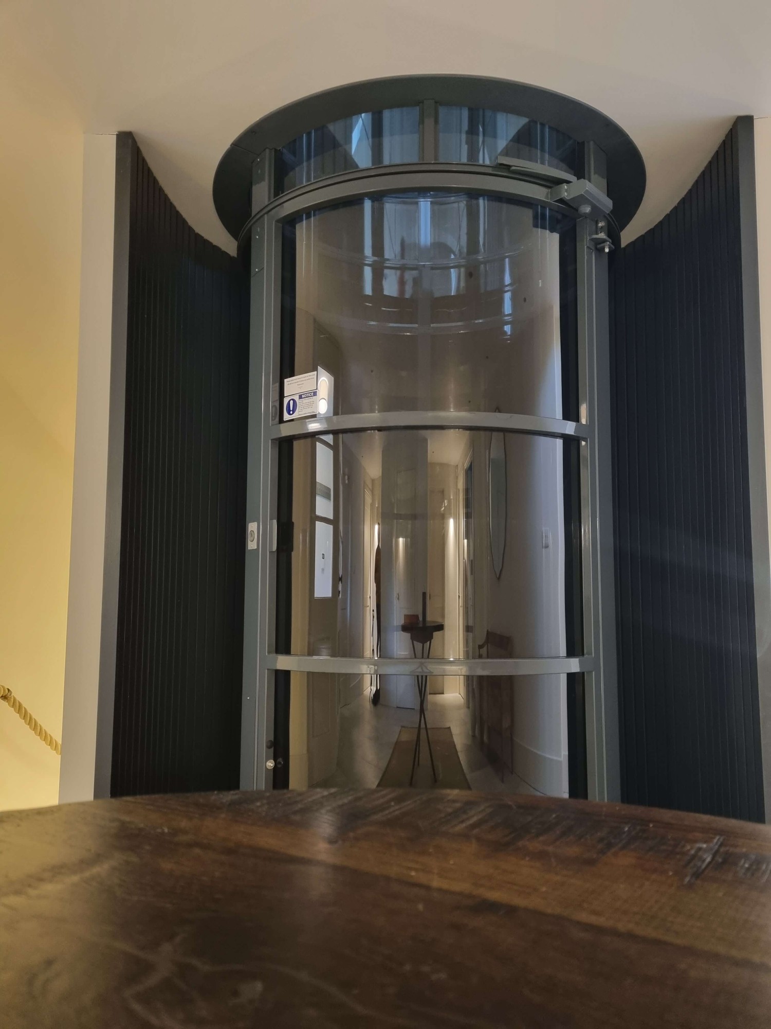 Following discussion with the client, it was decided that the PVE Pneumatic lift was the best choice for the property. It's sleek cylindrical design fit perfectly within the spiral staircase and offered 360-degree panoramic views, making the very most of the beautiful properties. We opted for the PVE 52 to ensure that there would be room for wheelchair accessibility while still offering all the same style and luxury as any PVE model. It fit in perfectly with the existing architecture of the building, creating a presence that both blends in with the property, and stands firm as a point of unique wow-factor.