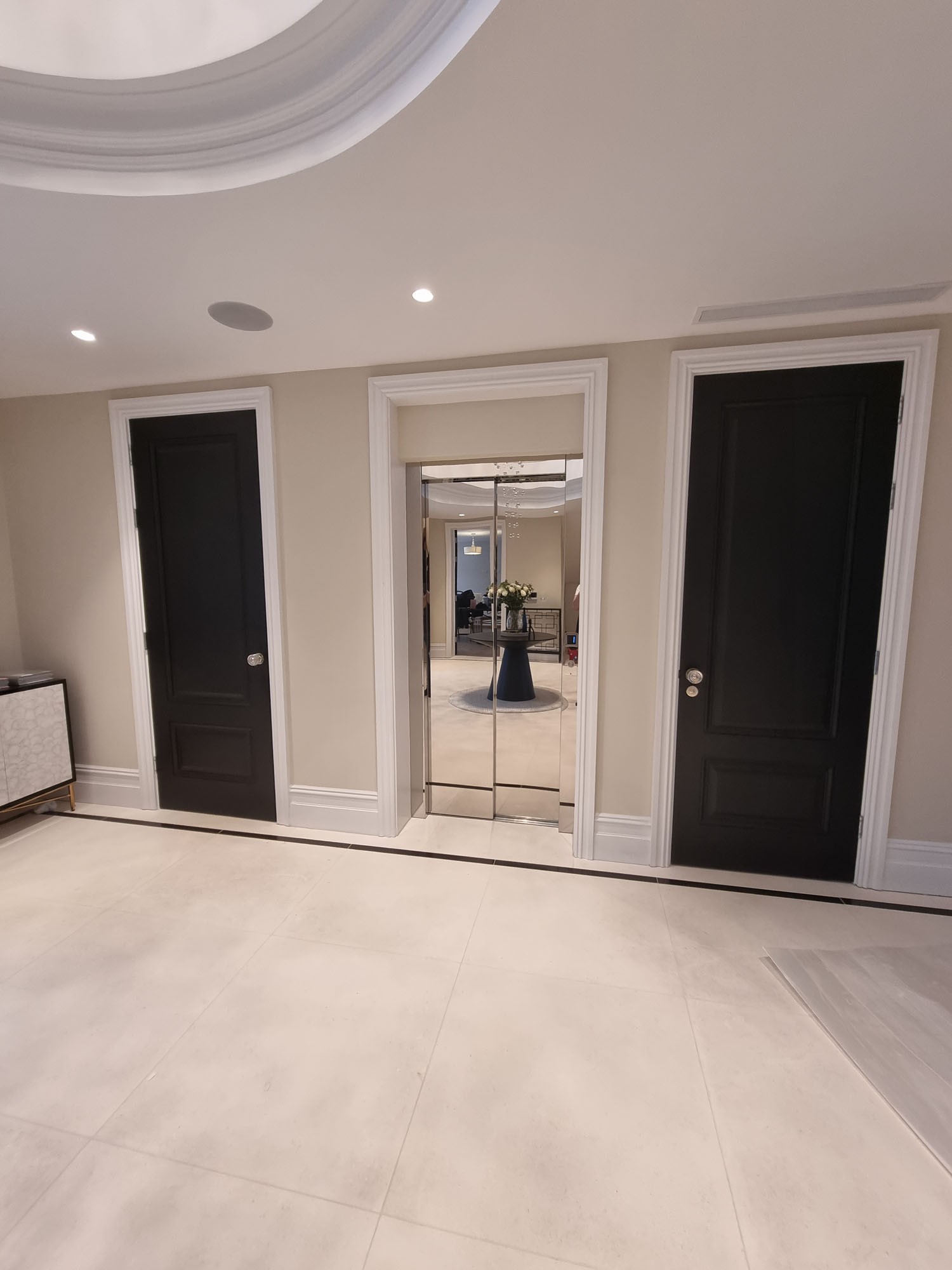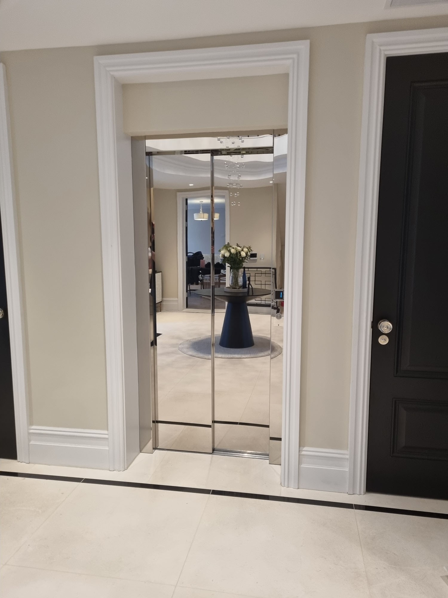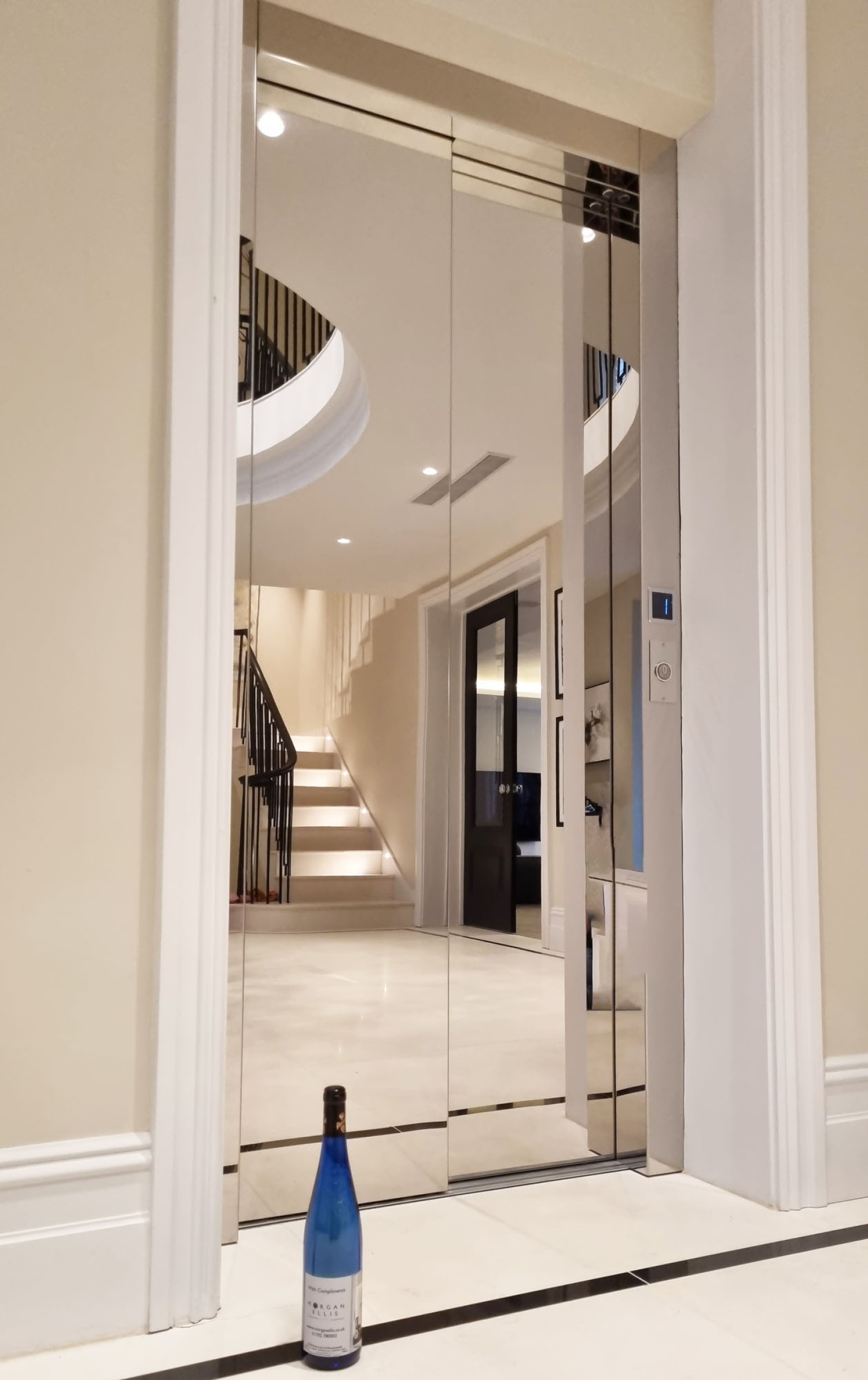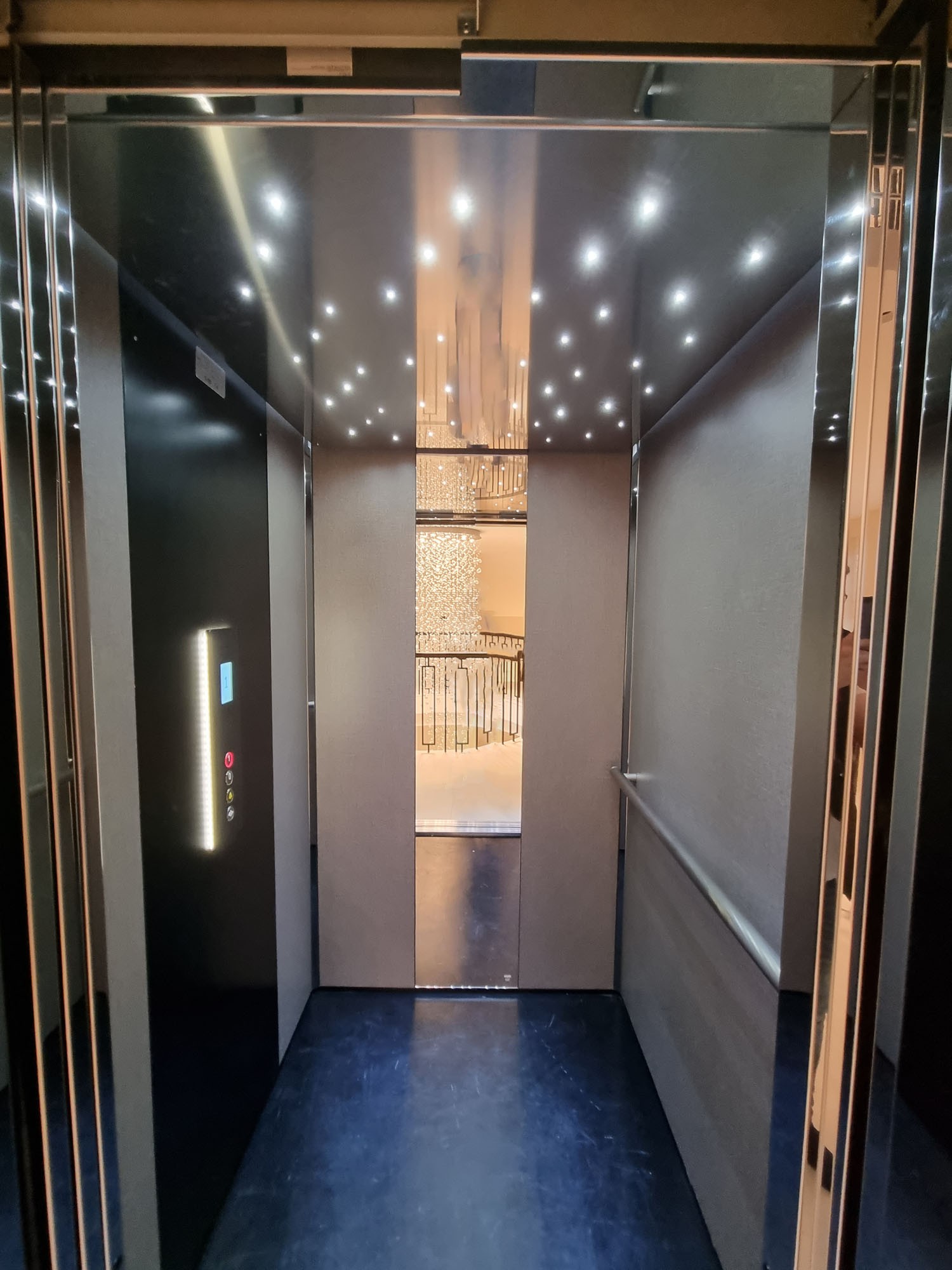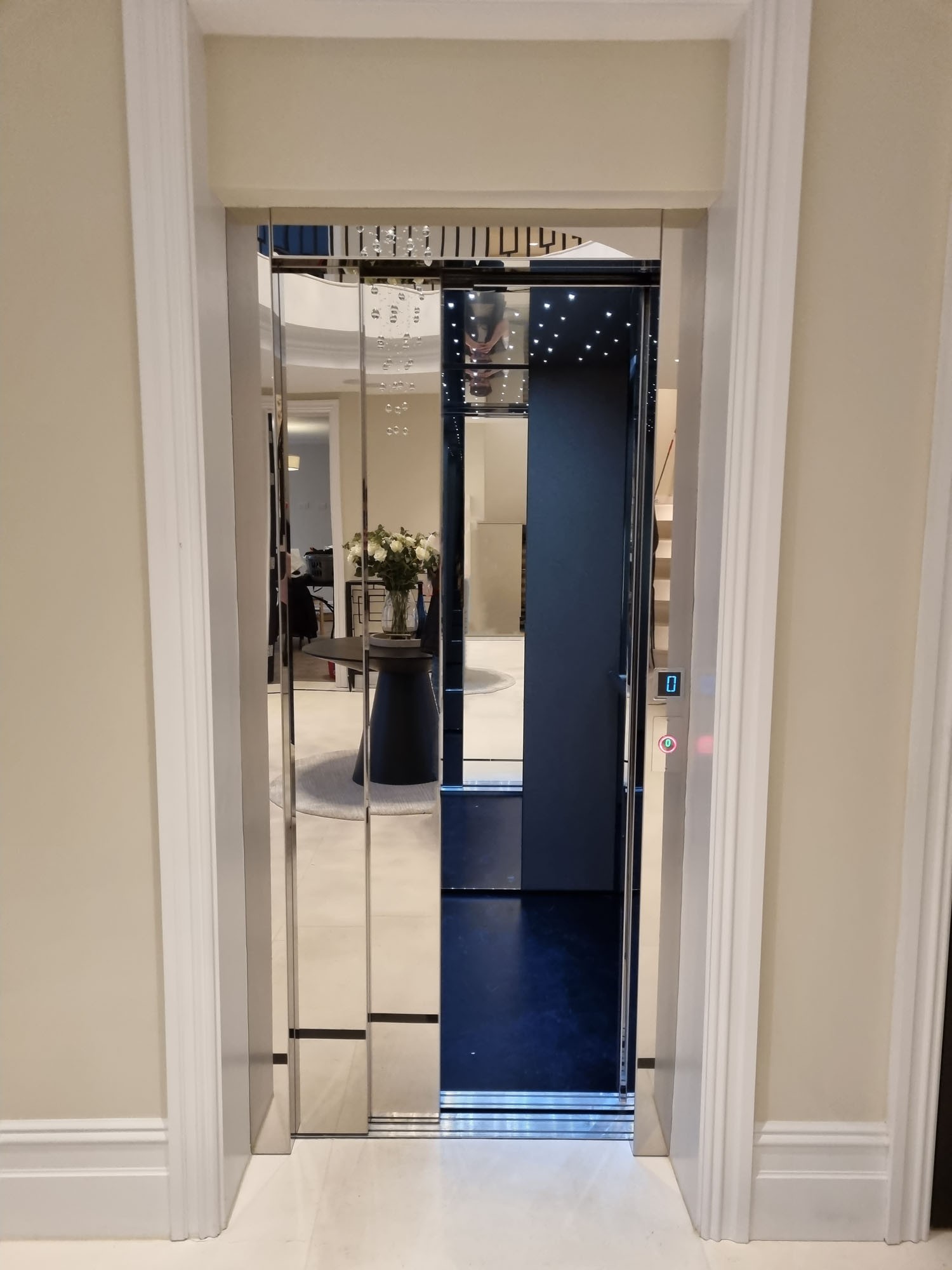 After discussing the needs and desires of the client in-depth, we agreed on a 2-stop Custom Altura Platinum lift featuring mirrored doors and a built-in lighting feature that mimicked starlight on the ceiling of the lift. The lift itself was also cleverly and aesthetically positioned between large wooden doors in the reception area on the ground floor, stopping in a grand corridor upstairs that provided access to the bedrooms. We worked closely with the client and their architect throughout the entire process and were thrilled that they were happy with the entire process, from the design through to installation and use of the lift.
